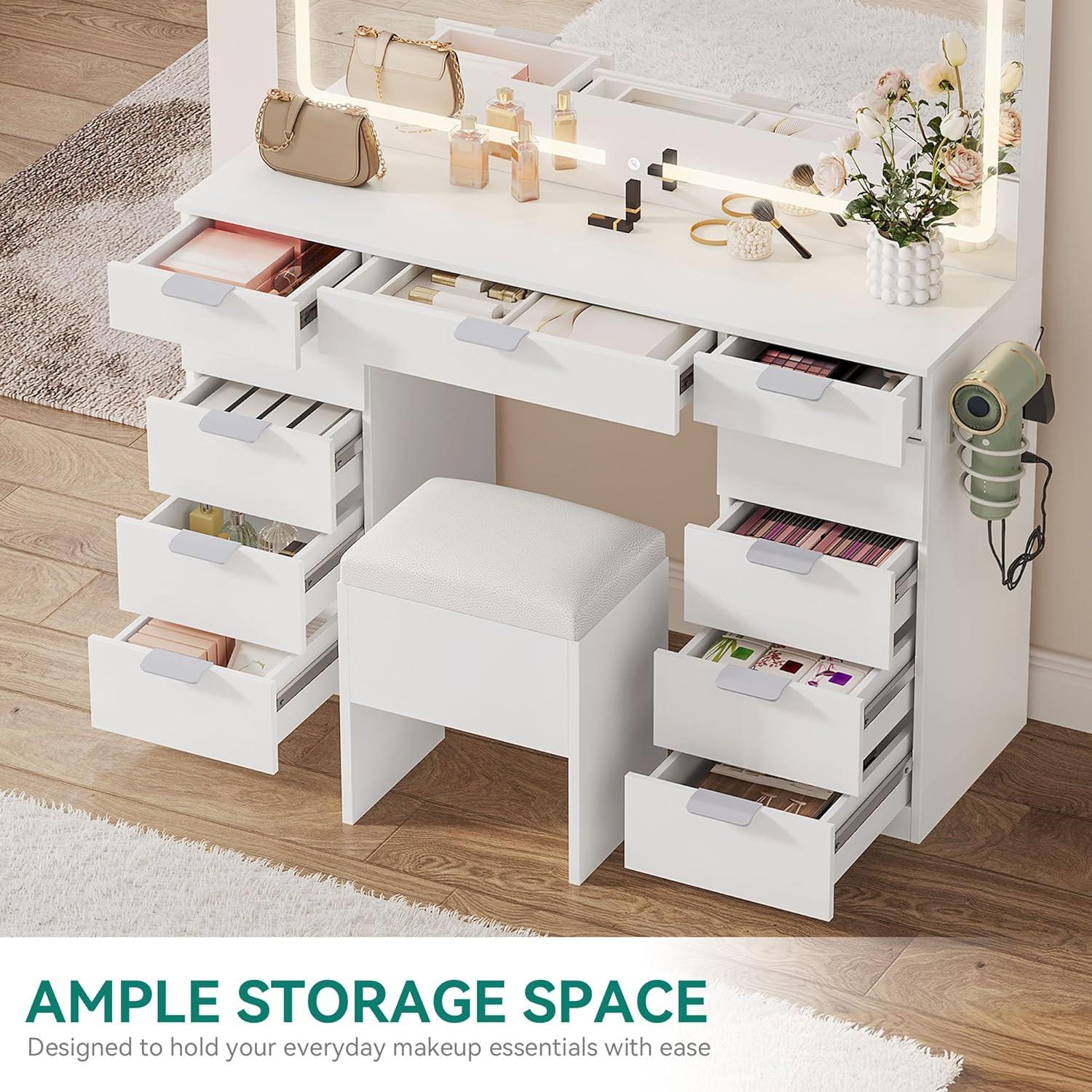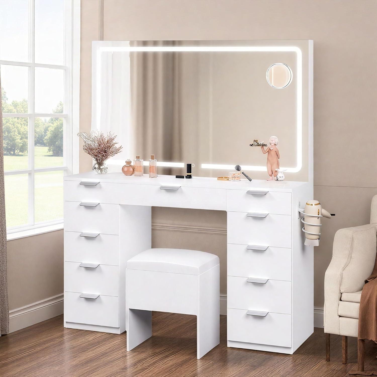 YITAHOME White Vanity Table with Mirror: 46" Makeup Desk with 11 Drawers Magnifying Mirror, Cushioned Storage Stool, Vanity Set with Power Outlet